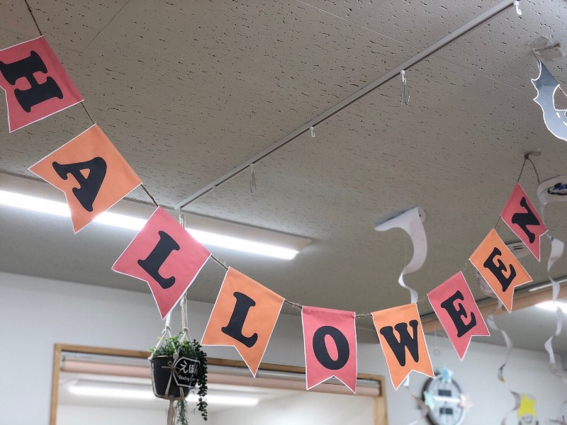 目と口をつけて、絵の具でペタペタした手形をオバケにペタリ!