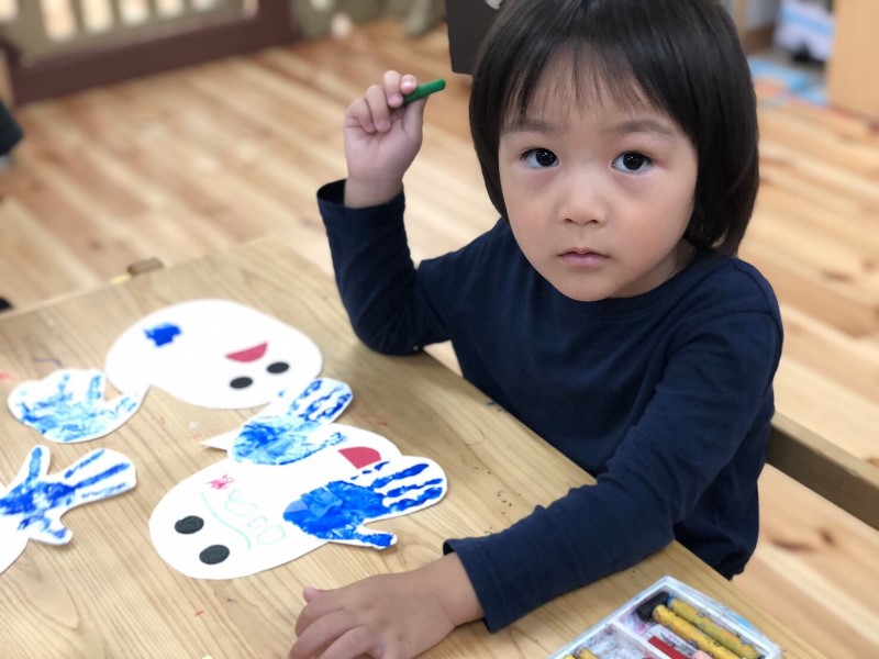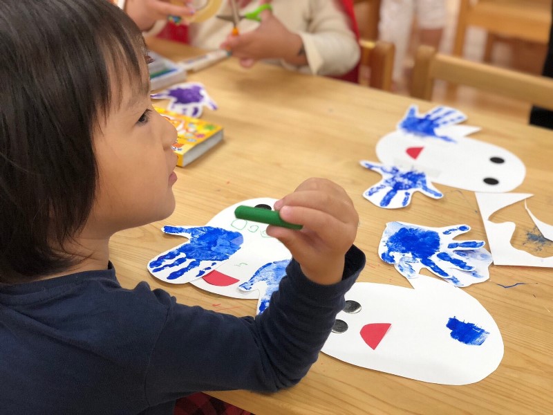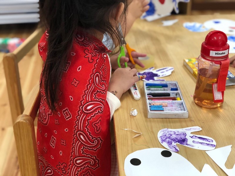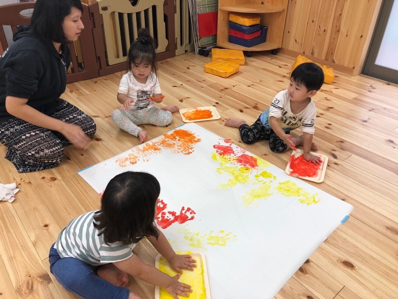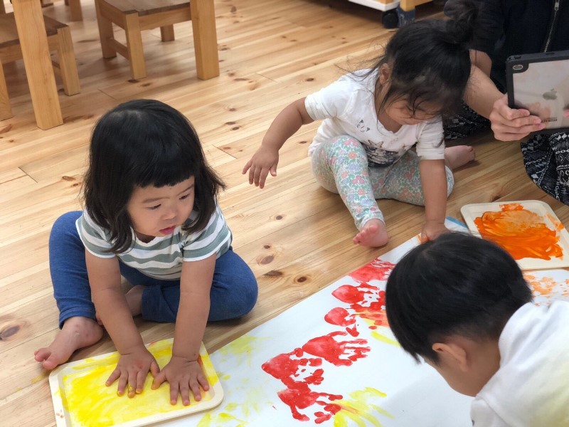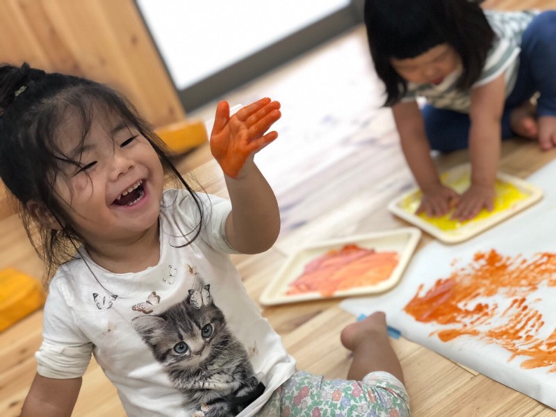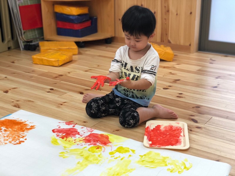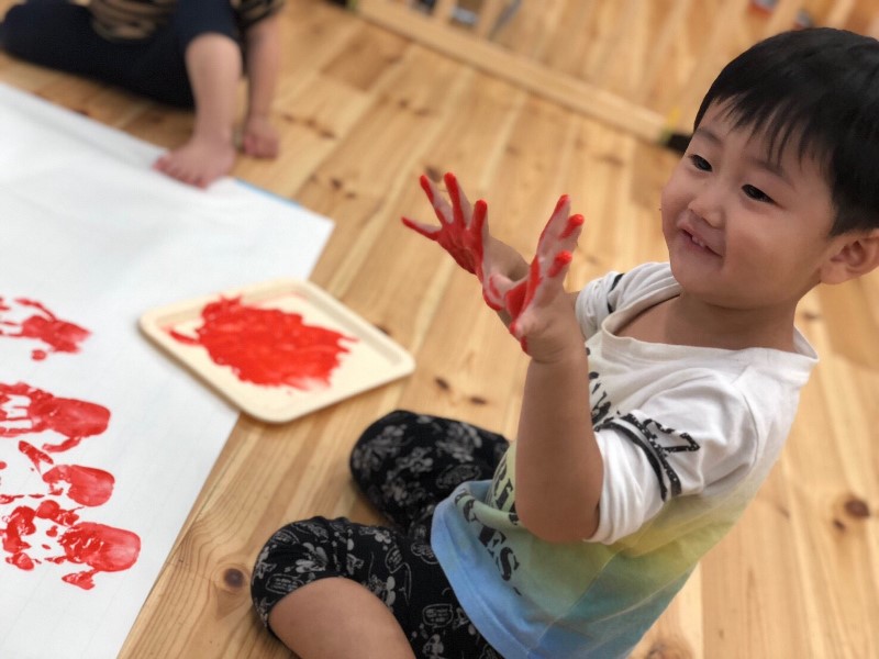 てのひらに絵の具をぺたっとつけて、まっしろの模造紙にぺたぺたぺた!