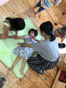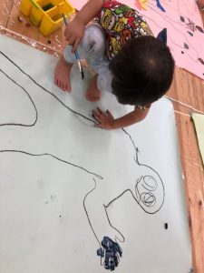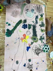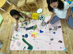 まっすぐ寝転ぶ子もいれば、片手をあげてみたり、大事なぬいぐるみも一緒にかたどったり、子ども達それぞれの「自分」ができました!