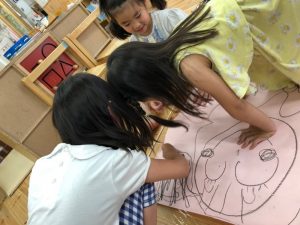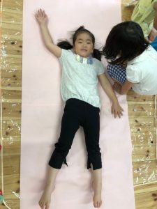 大きな模造紙の上に、好きなポーズで寝転んで、お友達に型をとってもらいます。