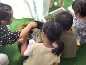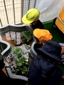 すくってきた生き物たちは、保育園のビオトープに入れました。
