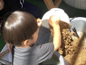 かたい砂利を手ですくったり、器ですくって、容器の中へザーッ!
