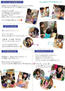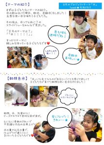 お知らせ 8月プロジェクト「水」 8月のプロジェクトテーマは「水」でした! 水の楽しさを味わいながら、水の大切さも学んだ一ヶ月。 実験したり、川で遊んだり、科学館に行ったり、紙すきをしたり、様々な遊びを展開していきました。 子どもたちの主体性が良くみられ、イキイキした姿が印象に残っています。 そんな様子をまとめましたので、ぜひご覧ください。 9月のプロジェクトテーマは「大きさ」です。 来月はどんなワクワクが待っているのかな?? 子どもたちの様子を楽しみにお待ちください!