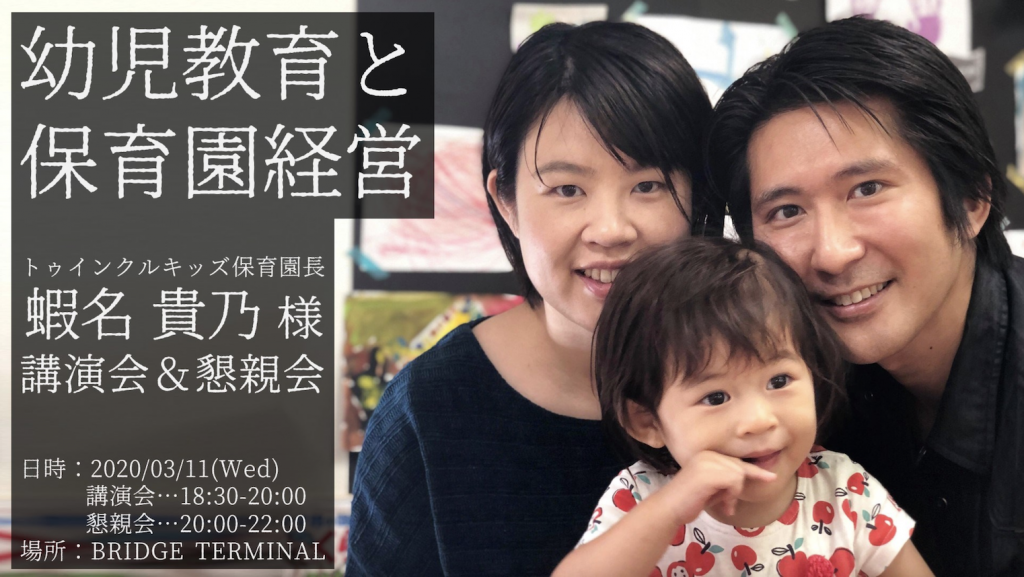 3月11日(水)に、トゥインクルキッズ代表取締役の蝦名が、大崎駅にあるソニーシティー大崎BRIDGE TERMINALにて幼児教育と保育園について講演を実施いたしました。