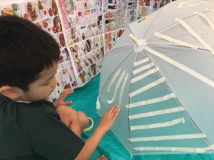 床にビニールシートを敷き詰めて、用意したのは大きなビニール傘と絵の具、シール、マスキングテープ。