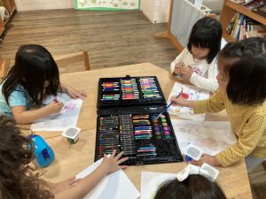 文字への興味が湧いてきていることで、周囲の環境に助けを借りて、一生懸命にお手紙を書く姿が。文字が書けないから…と諦めることなく、隣のお友だちの指先を観察したり、文字の代わりに心を込めて丁寧に絵を描いたり、目的からブレない姿が印象的でした。