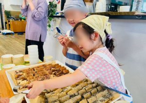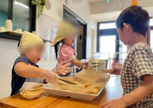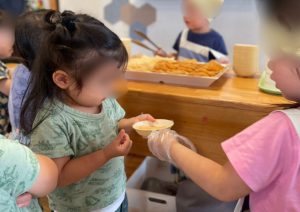 自分のおやつが無くなってしまわないように、配膳する前に自分のおやつを取っておく年長さんを普段から見ているからか、自分たちのぶんのおやつをしっかり取っておく2歳児さんに周りも思わず笑みがこぼれました^_^笑