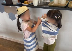 4歳児さんにエプロンの着方を教えてもらう3歳児さん^_^